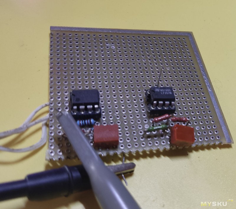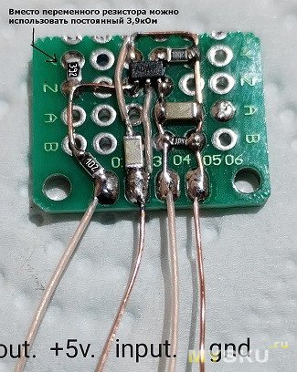 Установил в устройство и он не работает. Питание 5В, на вход приходит 0,5В и на выходе они же. Переменный резистор вообще ни на что не влияет. Ранее паял усилитель по схеме найденной на drive2, с ней всё работает, но требуется много таких усилков и паять их руками долго. Думал заменить на готовый блок на базе LM358 и ничего не вышло.