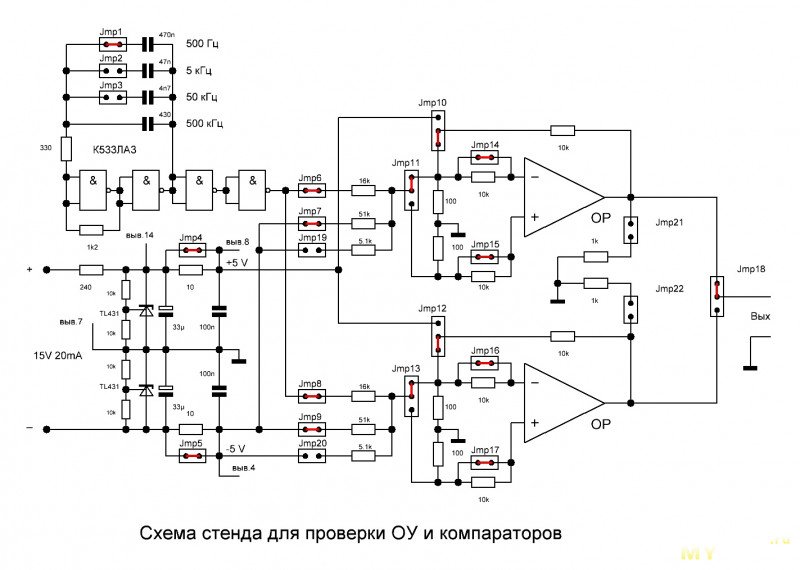 Собственно сама схема — это HEF4011, тестируемый операционник и три резистора.