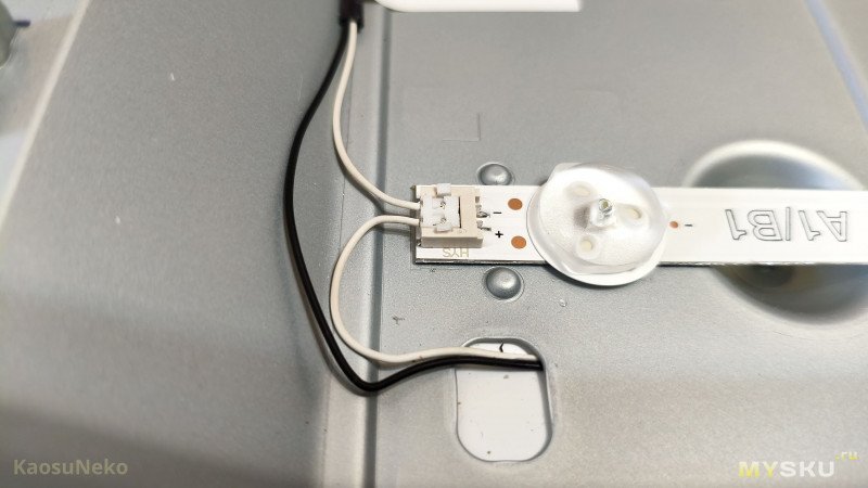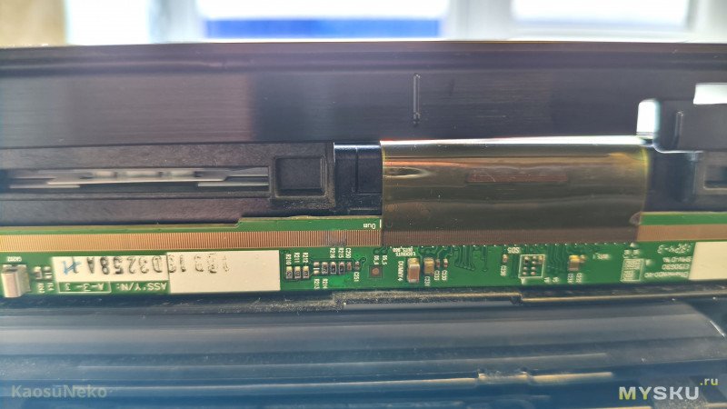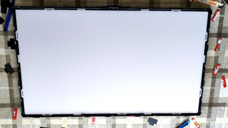 Собираем в обратном порядке, корыто устанавливаем очень аккуратно. Включаем… И видим мерцающие полосы на черном фоне. Только на черном. Либо T-CON, либо шлейфы, либо матрица, возможно — из-за текущего ремонтника.
