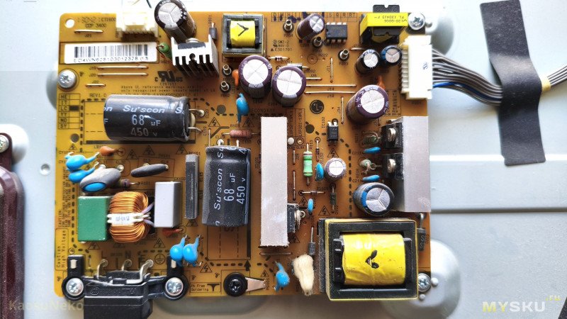 Блок питания уже с перепаянными резисторами в драйвере, также видно, что перепаивались некоторые конденсаторы.