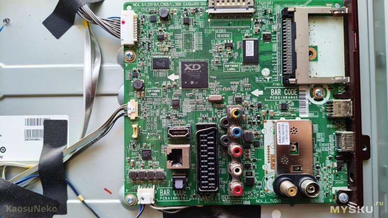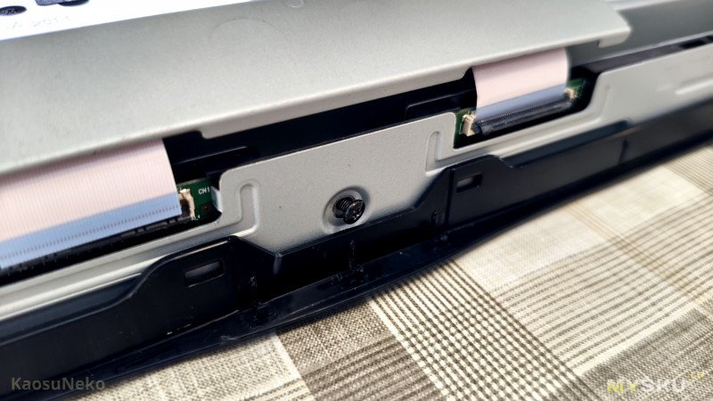 Эти LG позволяют не поднимать матрицу, а оставить ее в передней рамке. Главное — исключить ее движение, падение предметов и пробегание котов. Отсоединяем шлейфы, которые идут от T-CON платы к матрице и заводим их за ребро металлического корыта, чтобы не заломить. Отсоединяем IR приемник со светодиодом. Лучше снять все платы с корыта, но при аккуратном обращении и это не обязательно.