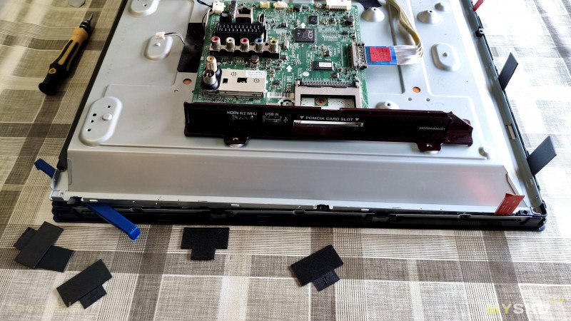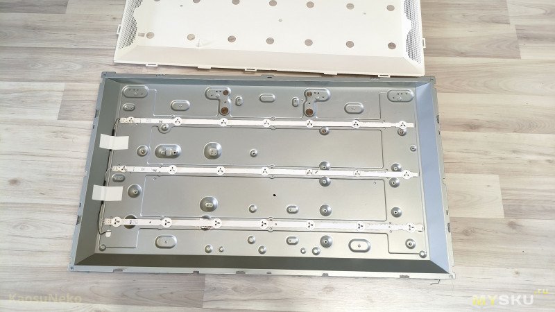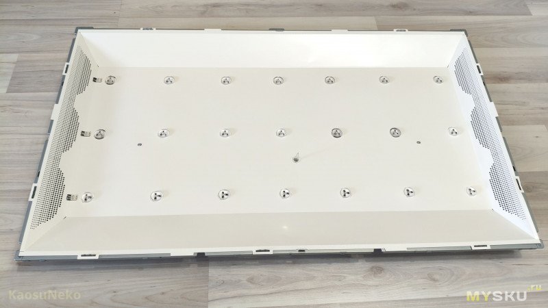 Откручиваем винты по периметру металлического корыта, это можно сделать даже не отстегивая переднюю пластиковую рамку. Заводим пластиковые карточки в защелки, аккуратно поднимает металлический корпус. Здесь есть 2 момента. Первое — нужно исключить смещение матрицы в передней рамке. Второе — пересчитать карточки, при снятии корыта они могут попасть между матрицей и рассеивателем, и видно их не будет. Точнее будет — после включения ТВ.