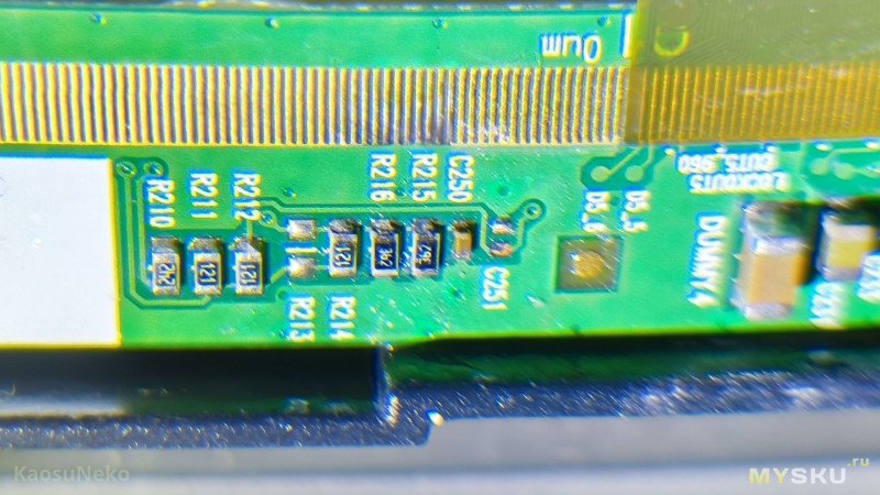 И сразу видим окислы на россыпи резисторов и конденсаторов рядом со шлейфом. Плату когда-то кто-то чистил, конденсатор С251, судя по состоянию падов, оторвали в процессе. Еще раз все чистим. Для начала пробуем пропаять то, что есть, если на компонентах не съело металлизацию (таких конденсаторов в наличии у меня все равно нет, а вот резисторы можно и перекатать). Опять чистим, внимательно осматриваем пады в лупу, остаемся довольны результатом. Включаем, и вставляем по пол дня для проверки — работает.
