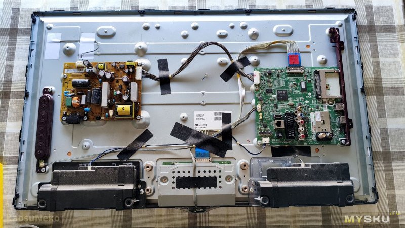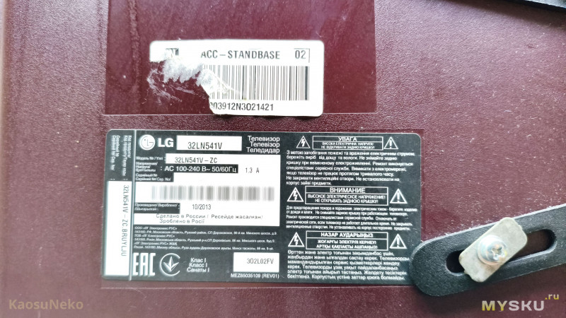 Имеем LG 32LN541V возрастом 12 лет, со слов владельца, уже бывший в ремонте. Разборка его довольно проста — телевизор размещаем на столе экраном вниз, откручиваем саморезы и метрические винты, которые держат пластиковую заднюю крышку.
