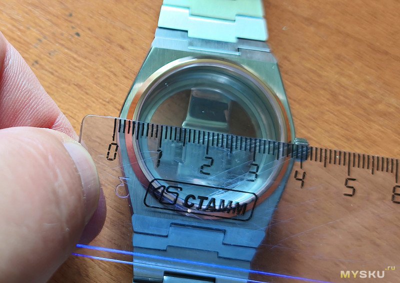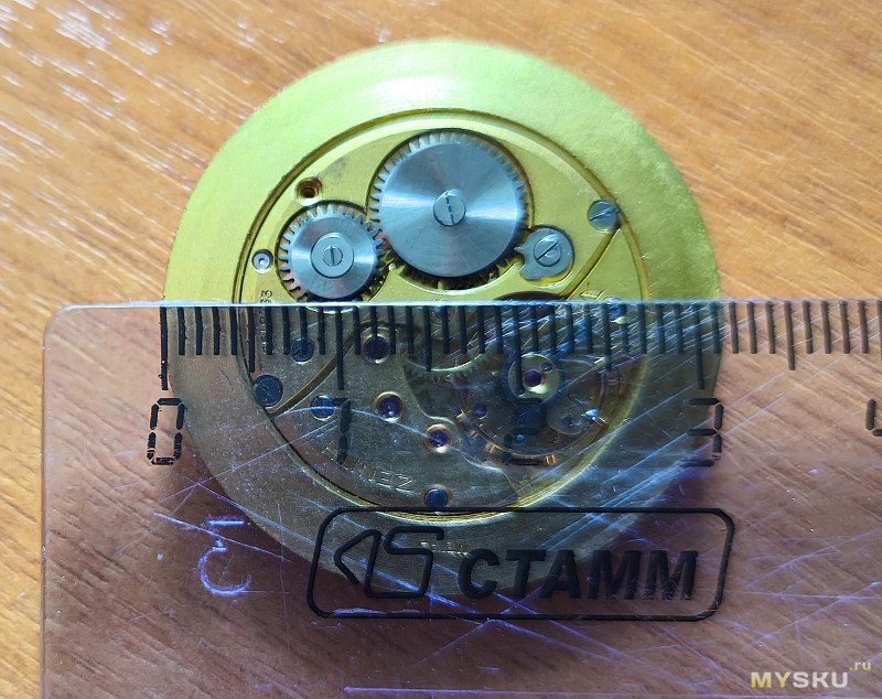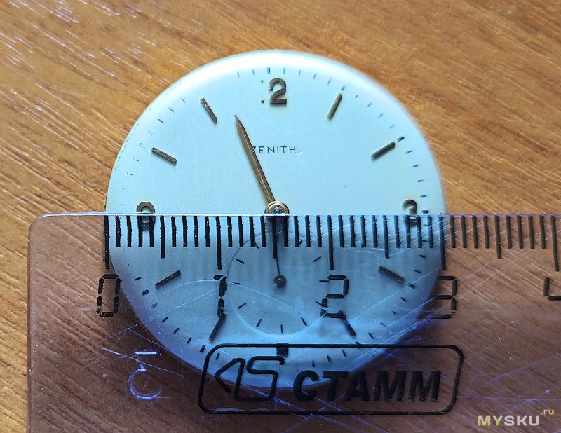 Размер циферблата, полностью совпадает с размером проставочного кольца закрепленного на механизме и составляет 32 мм. В этом обзоре все размеры снимал с помощью линейки, штангенциркуль отжали знакомые на некоторое время….На фото измерительная линейка иногда отображает другие показатели, но это из-за угла обзора такой оптический эффект, фактический размер я указываю в обзоре.