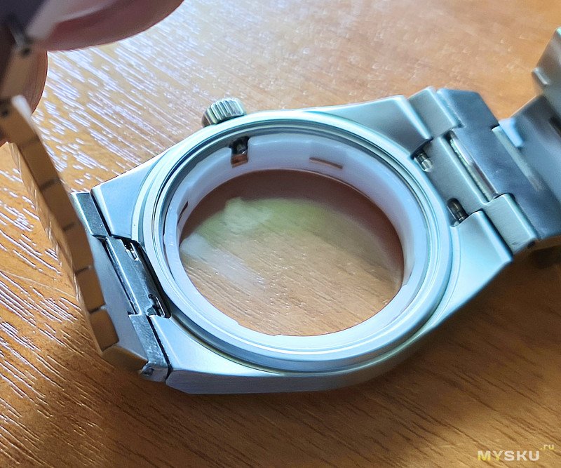 Корпус продаётся под механизм Seiko NH35, именно под этот механизм в комплекте имеется пластиковое проставочное кольцо для фиксации механизма в корпусе (нам оно не пригодиться).