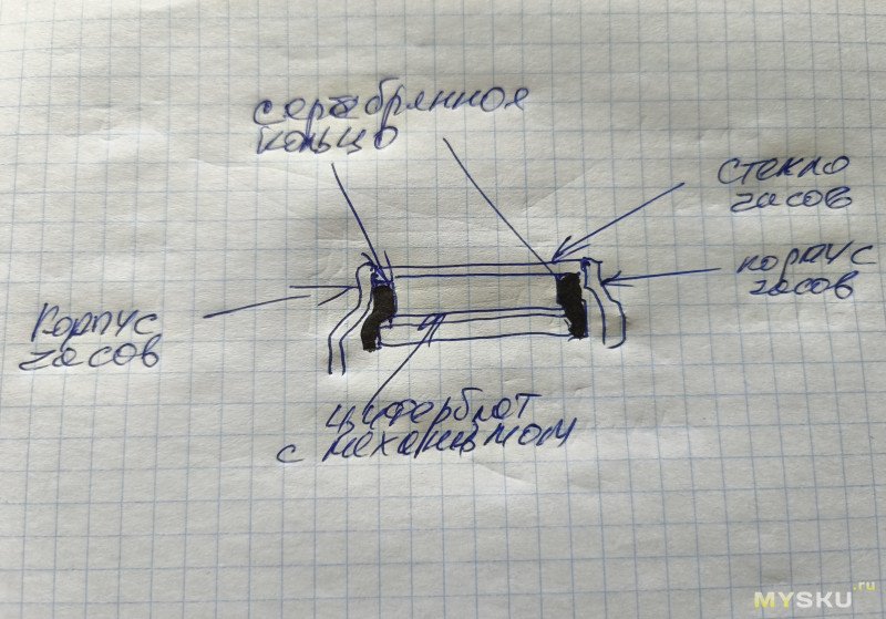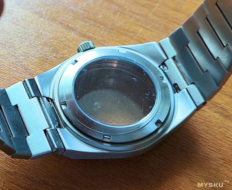 Вот предварительный вид еще не собранных часов, и заодно проверка стекла часов на «сапфирость» тестом на каплю