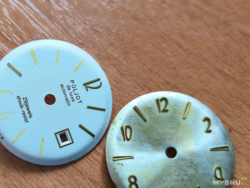 Видимо корпус от часов был из золота, поэтому часы так безжалостно были разграблены, корпус и заводную головку на аффинаж, остальное «скинули» по бросовой цене. Циферблат имеет конечно кое какие изъяны, плохо сохранилась секундная шкала по периметру, думаю это можно «дорисовать». Так же потеряна метка «1» на 12 часов, это тоже постараемся исправить «позаимствовав» от «доноров» отечественного производства.