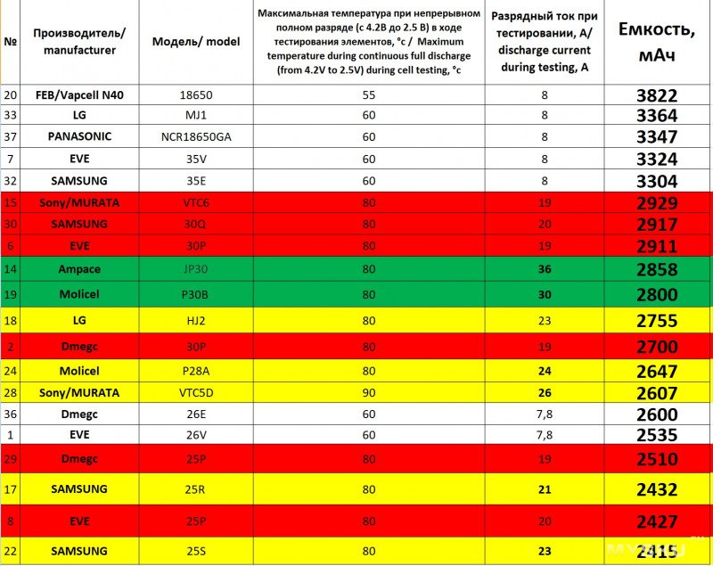 Низкотоковые модели тестировались на максимальных токах согласно Datasheet, но все производители рекомендуют не превышать разряд 1С, для увеличения срока службы элементов.