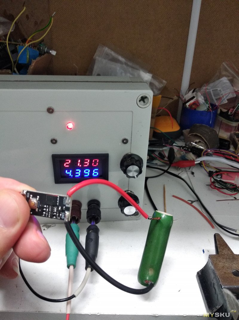 Лабораторные испытания вселили надежду. Проволочный резистор в качестве нагрузки, напряжение 21 вольт, ток чуть больше четырёх ампер, многократный «тыц» кнопкой.