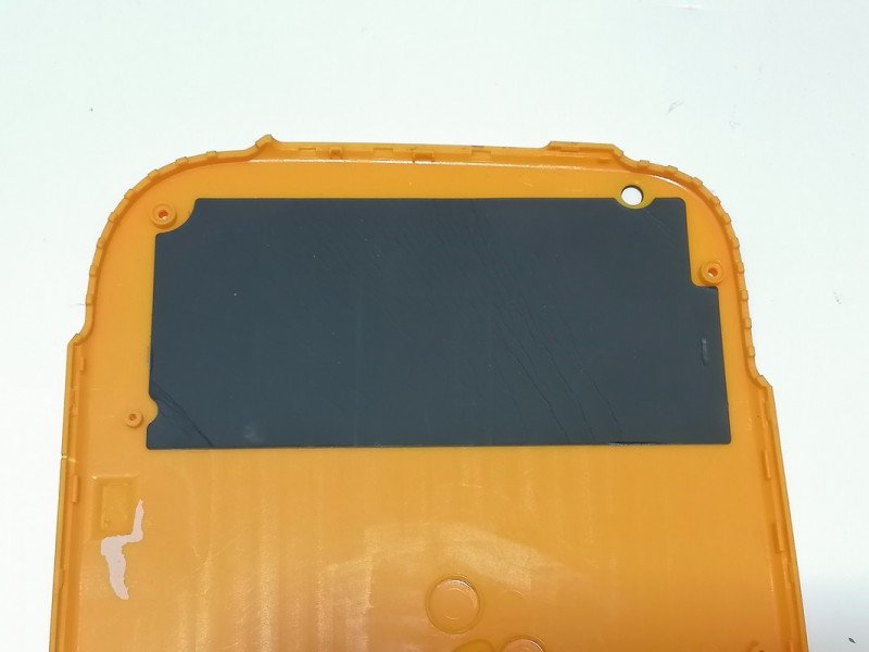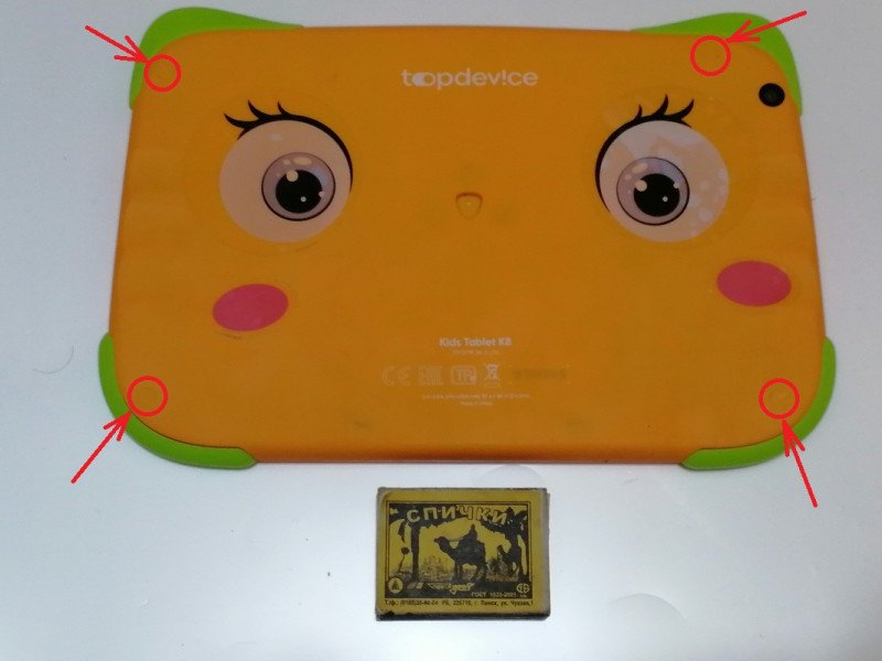 Для защиты от ударов снабжен силиконовыми накладками на уголки, но раздолбать тачскрин это всё равно не помешало.Так как живучесть защелок корпуса при ударе вызывает обоснованные сомнения, он дополнительно собран на винты. А чтобы юное дарование не попыталось немедленно применить папину отвертку, винты прикрыты заглушками в цвет корпуса: