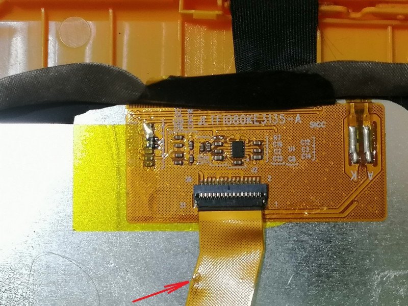 Одноячеечный литий-ионный аккумулятор имеет емкость 4000 мАч и типоразмер 30100103 — 103*100*3,0 мм. Он приклеен на две полоски двухсторонего скотча прямо на шлейфы матрицы(поэтому при отклейке я этот самый шлейф повредил шпателем) и кнопок (который я оторвал наглухо с концами). Будьте осторожны, если всё же придется эту дичь кому-то чинить.Плата матрицы с маркировкой JLTF1080KE3135-A.