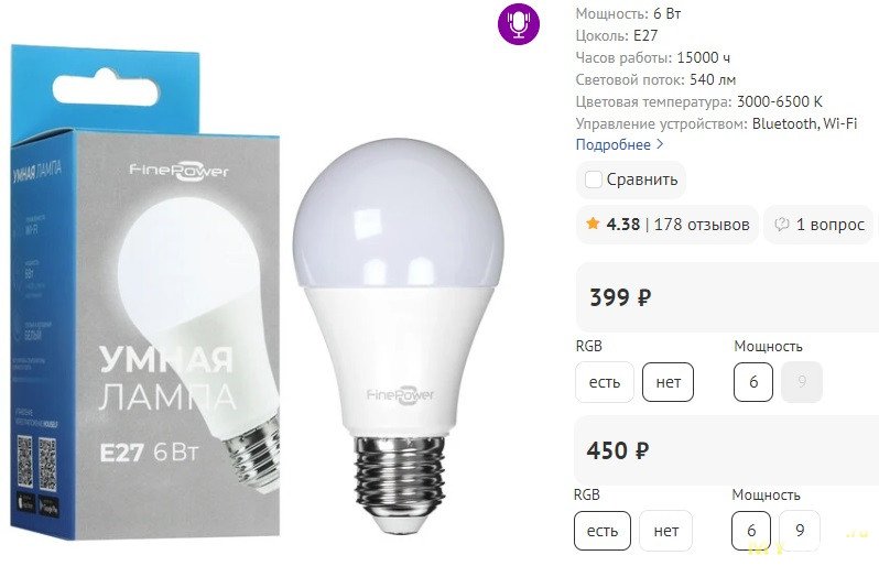 Всего у нас 3 вида лампочек: бело-желтая E27 (99 руб.), RGB E27 (99 руб.), RGB E14 (80 руб.).