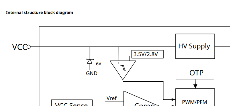 После выхода на рабочий режим питание VCC подхватывается от вспомогательной обмотки или через внутренний регулятор от DRAIN.