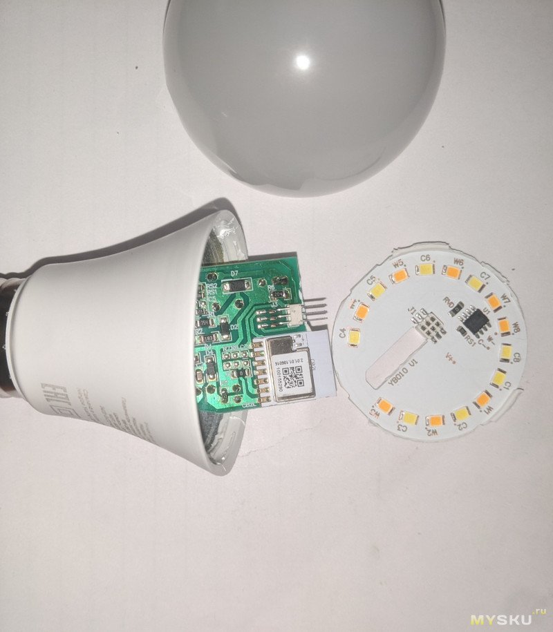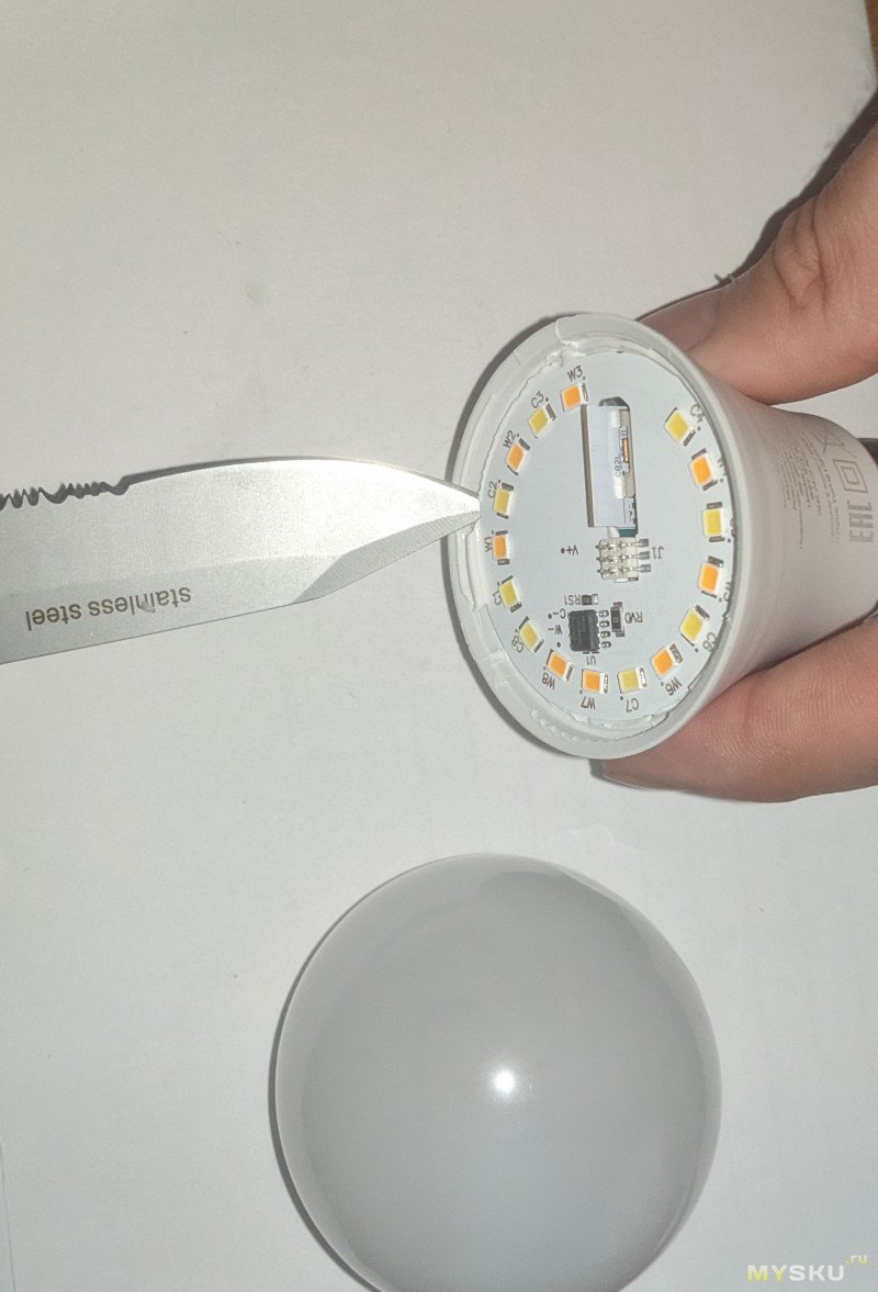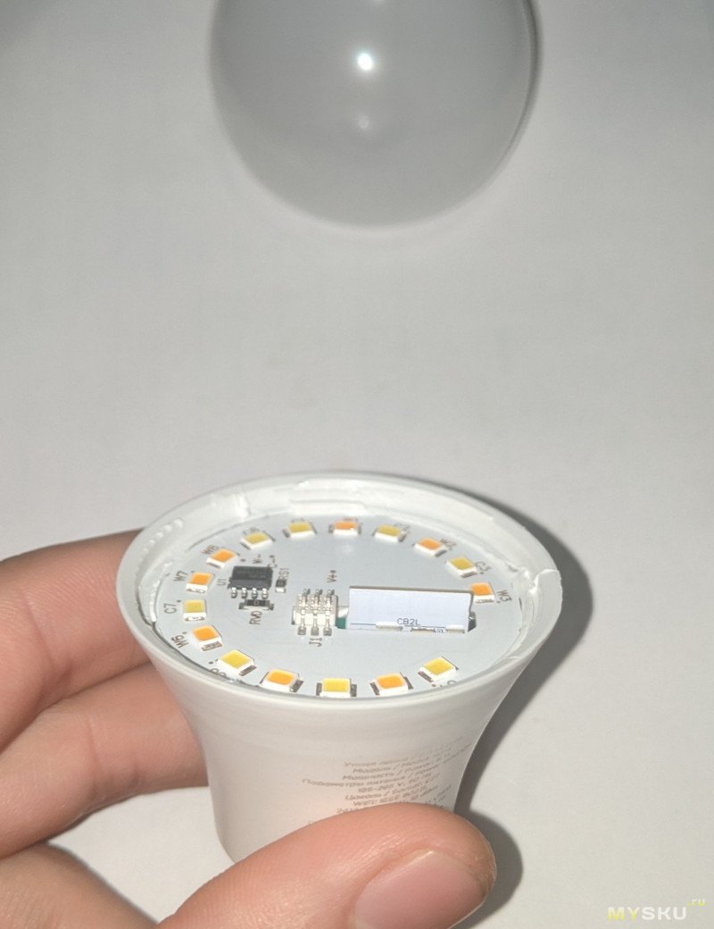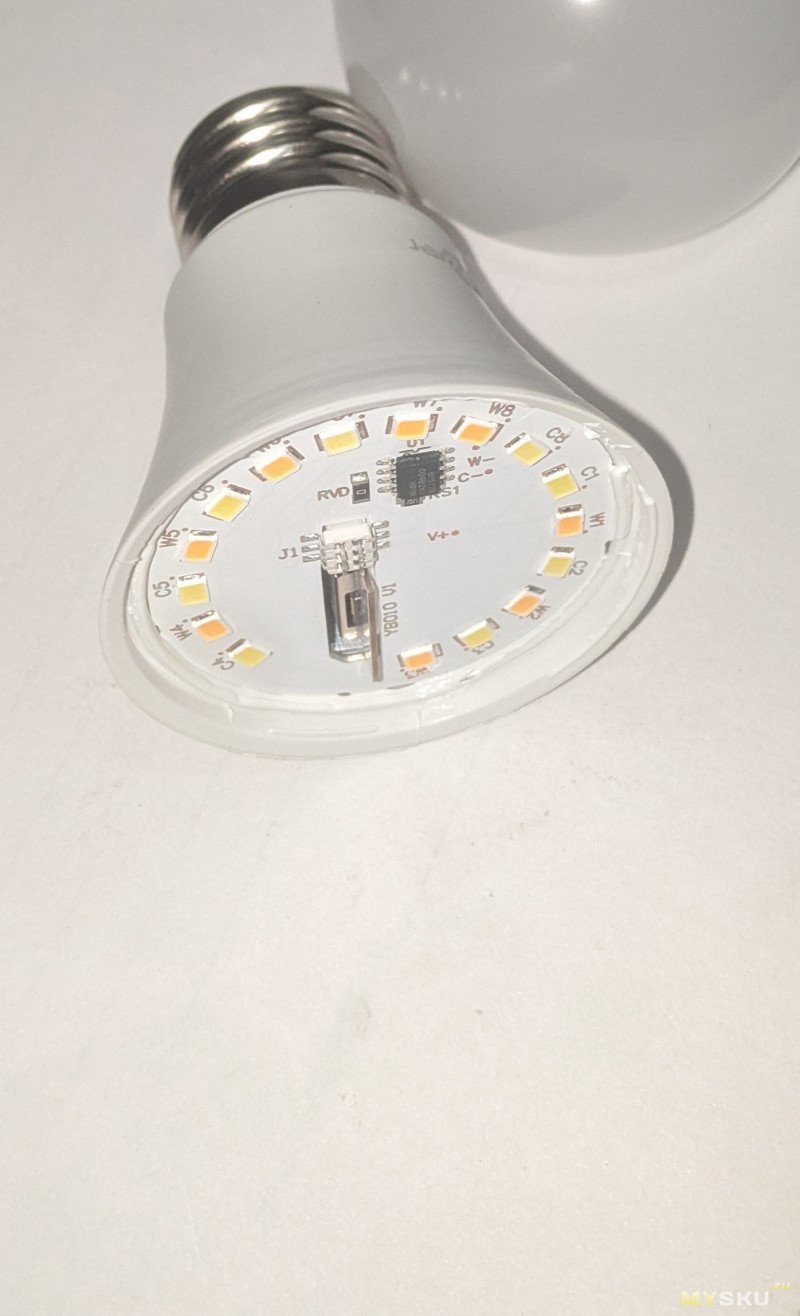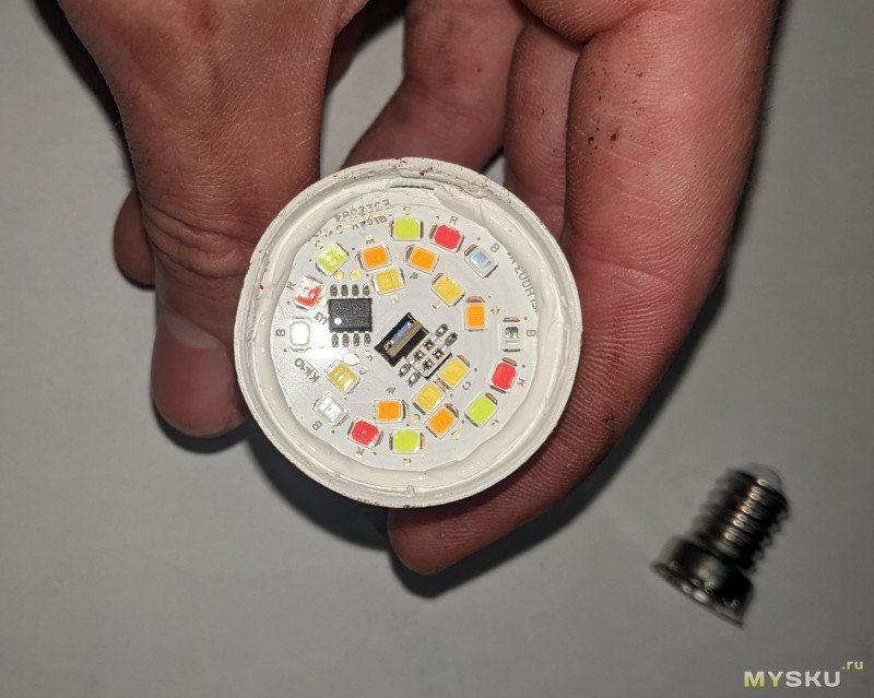 Я было начал разбирать RGB E27, но привычно открыв грушу рассеивателя, как на самой первой лампочке, увидел просто чуть расширенную версию контроллера E14 вместе с торчащим CB2L.