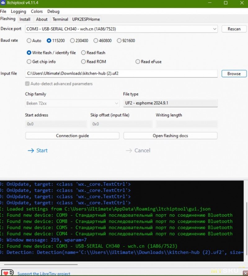 Прошивка осуществляется подключением к TTL-адаптеру и заливки базового загрузчика либо через ItChipTool(прошивка собирается через интерфейс ESPHome умного дома), либо используя OpenBeken (через BK7231GUIFlashTool).