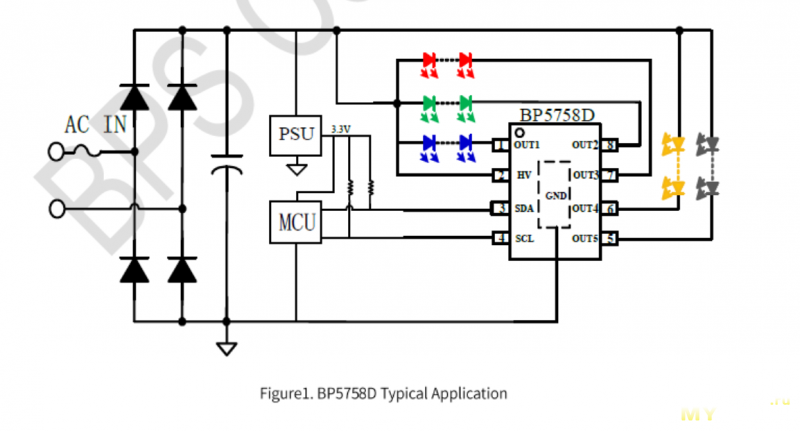 Второй драйвер BP5758D. Это уже более сложный 5-канальный драйвер, который управляется по шине I2C.