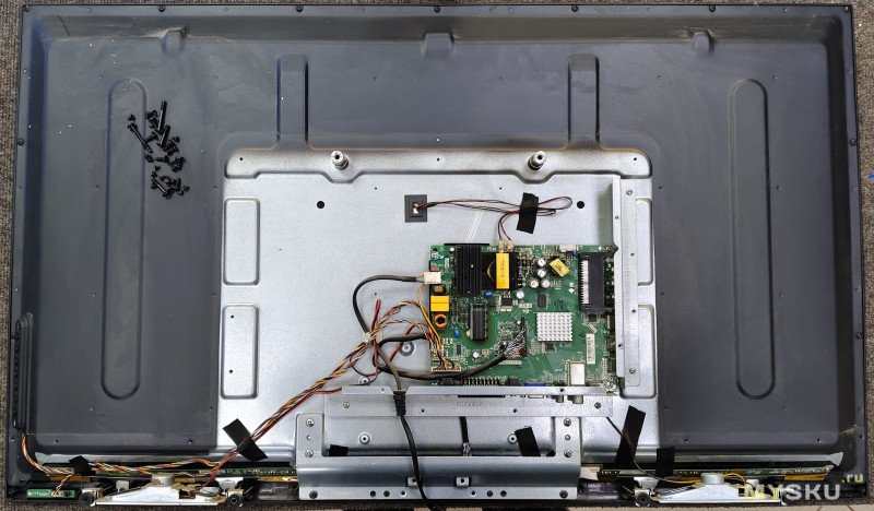 Начнем разборку. Располагаем телевизор экраном вниз на ровной поверхности, откручиваем винты задней крышки и снимаем её.