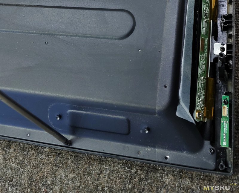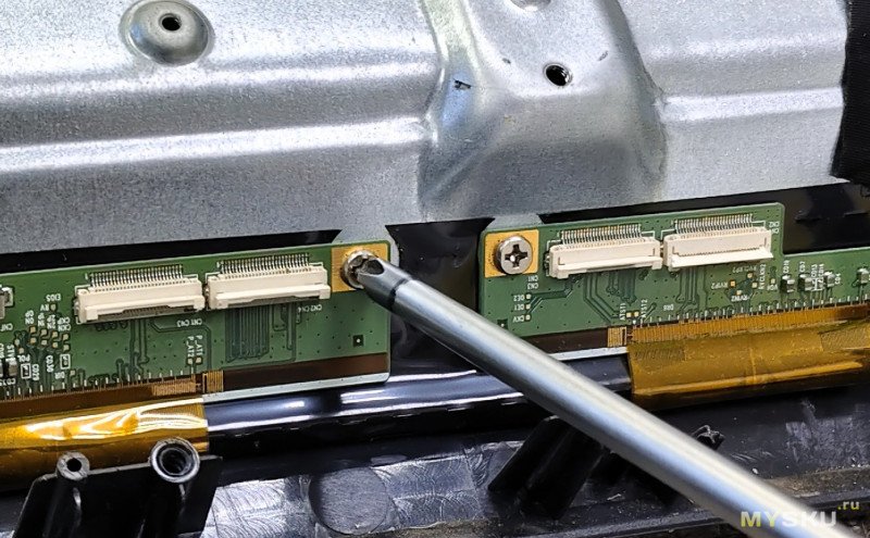 Откручиваем винты рамки, в которой лежит сама матрица. Часть винтов расположены под боковыми шлейфами, поэтому необходимо снять стекло.