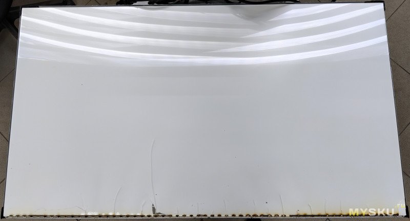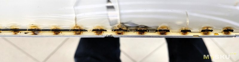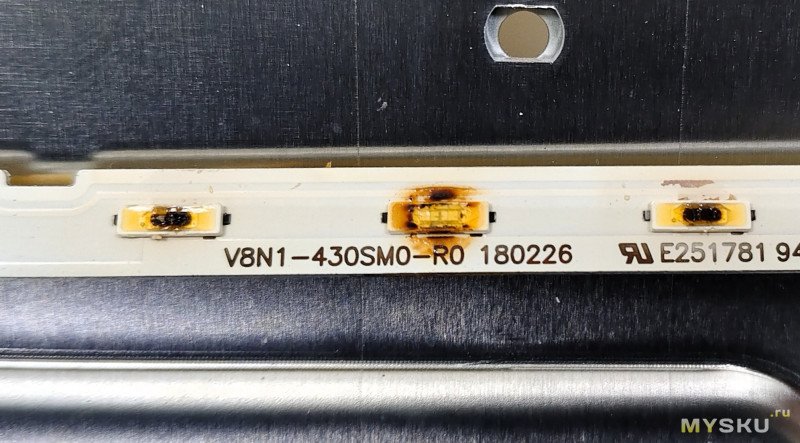 В телевизорах Samsung серии 43NU 43N 43RU (40NU 49NU 50NU 55NU) имеется заводской дефект — при выходе из строя подсветки часто повреждается и рассеиватель, светодиоды буквально его плавят (а сами они превращаются в уголь) и появляются трещины. Если поменять только светодиоды — изображение будет с засветами/затемнениями, в зависимости от степени повреждения, поэтому нужно менять все в сборе.