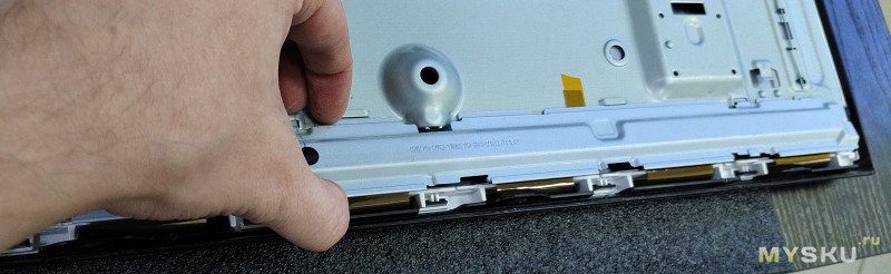 В моем случае все струны извлекать не пришлось, а только одну боковую, в остальных местах крышка отщелкнулась. Аккуратно отщелкивайте снизу тв — за пластиком расположены шлейфы матрицы, не запихивайте карточку или лопатку глубоко.