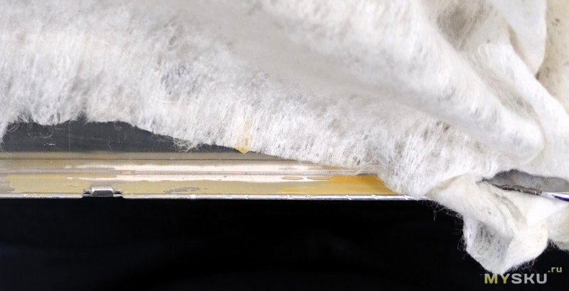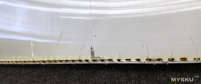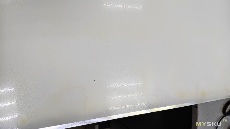 Еще обнаружил желтые пятна на рассеивающей пленке, последствия плавления оргстекла — стер изопропиловым спиртом, получилось без следов.