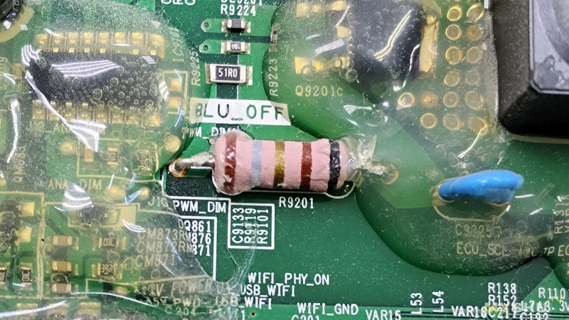 Снижаем ток на подсветку. Для этого нужно заменить резистор R9201 (номинал 1.8 — 2 ом) на номинал выше, например 2.5 — 3 ом.