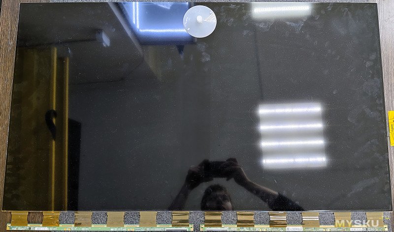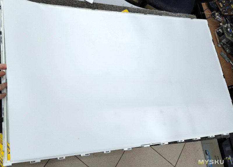 Оказывается — под матрицей в рамке лежат рассеивающие свет пленки и они снимаются вместе с ней. Конечно можно снять и так, но под весом они прогибаются и если их назад потом ставить — нормально они не лягут. Поэтому снимаем отдельно матрицу, отдельно пленки, потом уже отщелкиваем рамку.