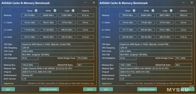 Для начала тест памяти AIDA 64. Слева одноканальный режим, справа двухканальный. Как видите скорость чтения\записи увеличилась почти в два раза.