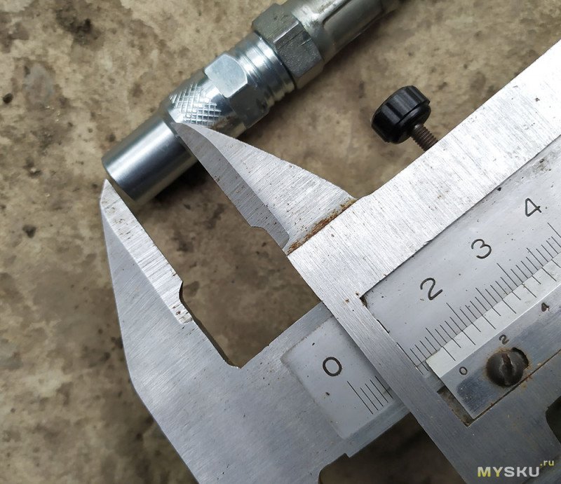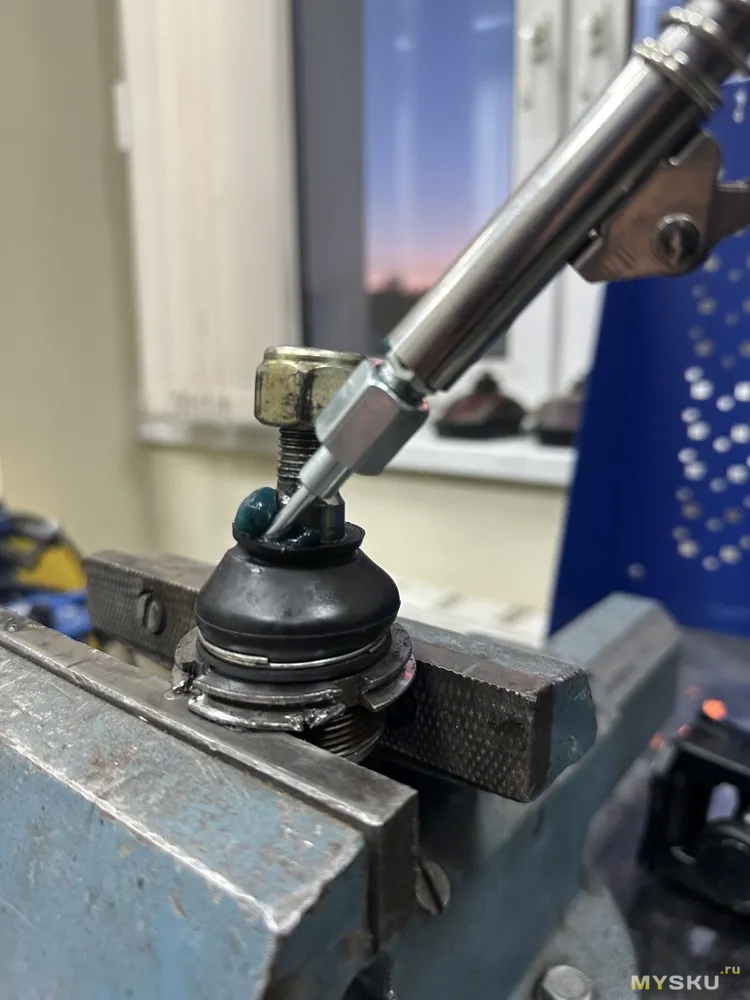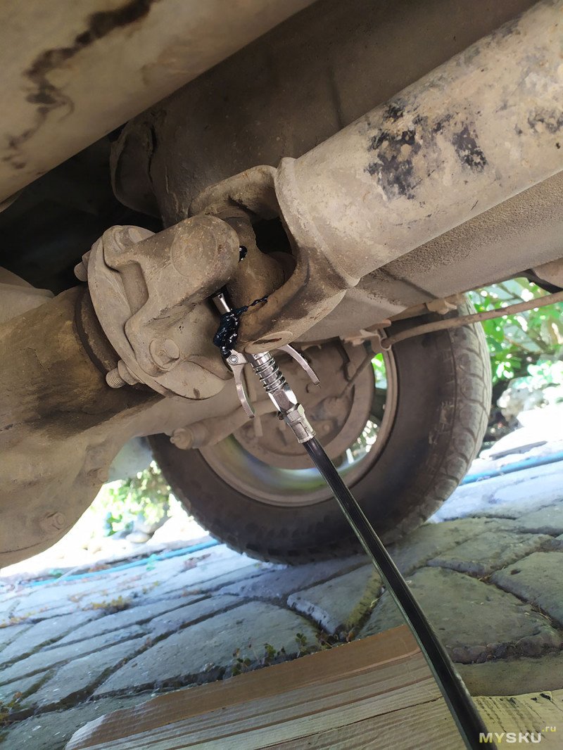 Не обращайте внимание на висящие куски смазки :) Это не из соединения с тавотницей. Продавливал старую смазку через крестовину, пока не пошла чистая, свежая.Итого: Наконечник рабочий, удобный — тест пройден, буду пользовать!