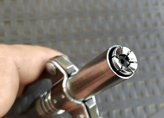 Пружина относительно жесткая, но чрезмерного усилия для работы не требуется. При сжатии лапок цанга уходит вперед и при этом легко одевается на тавотницу, после отпускания довольно прочно фиксируется. При этом, за счет большого количества лепестков диафрагмы, смазка действительно идет только в смазываемый узел (хотя, если честно, у меня и на другой насадке тоже все чисто :)