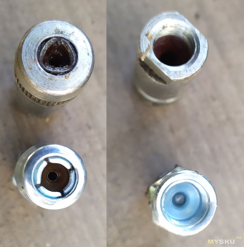 В наконечнике имеется клапан- подпружиненный шарик.Вверху старая насадка, внизу новая