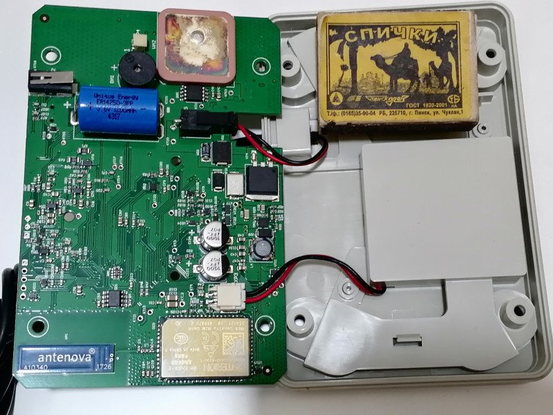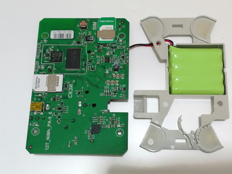 На плате сразу бросаются в глаза антенна GPS/GLONASS приемника и литиевый элемент питания типоразмера 14250. Основным источником питания является 4S1P сборка NiMH аккумуляторов типоразмера ААА. Видеть такое в устройстве 2018 года выпуска несколько странно, но видимо у разработчиков были какие-то соображения. Не исключаю, что в более поздних устройствах использованы литий-полимерные аккумуляторы. Здесь же расположен 3G модем для общения со стационарной наземной частью системы и концевой выключатель, срабатывающий на вскрытие корпуса.