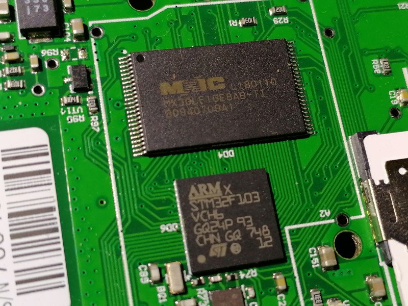 Процессор достаточно фаршированный — 32-битный ARM Cortex-M3 c 48 кбайт ОЗУ и 256 кбайт флэш-памяти. Увы, выполнен в корпусе BGA, так что с пересадкой на собственную плату будут сложности. Можно, конечно, извратиться и распаять его проводками, перевернув пузом вверх, но при наличии «синих таблеток» по два доллара это не особо осмысленно. Внешняя флэшка имеет емкость 128 мегабайт.