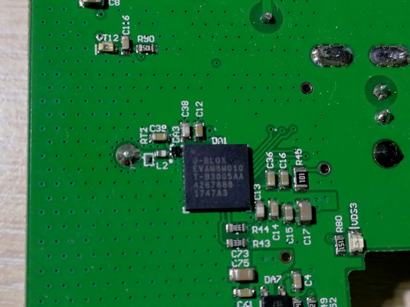 Навигационный приемник от U-BLOX и его входные цепи. Умеет работать с выходными интерфейсами UART, I2C, USB. Увы, выход похоже уходит во внутренние слои платы.
