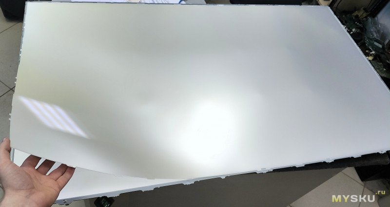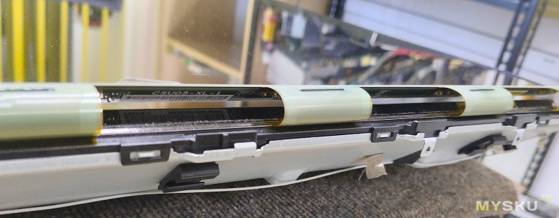 Отклеиваем старые планки, устанавливаем новые. Полчаса устанавливал отражатель — постоянно приклеивался когда этого мне было не нужно). Ну и собираем всё в обратной последовательности. При установке матрицы и защелкивании нажимайте строго на рамку, никакого давления на стекло! Особенно внимательно снизу матрицы, где шлейфы.