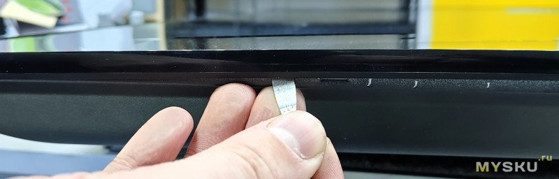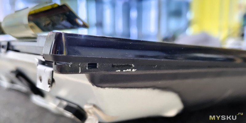 Отщелкиваем рамку с приклеенной на ней матрицей. Я начал снизу с угла. Защелки довольно сильные, с карточкой не получится. Я использовал металлическую лопатку. Аккуратно, не спеша, отщелкиваем рамку. Если защелки не поддаются — значит просто на них не попали) Они расположены каждые 10-15 см (примерно)