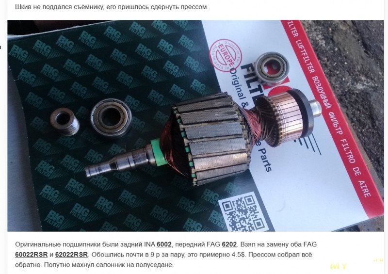 Передний подшипник, где насажен шкив, более-менее живой, а вот задний — совсем плох.
