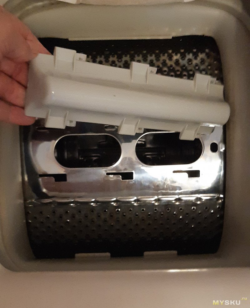Досталась «по наследству» вертикалка, стирать стирает, но сильно уж прыгает, и звуки иногда стремные издает при отжиме. Подумал, не дело, купил комплект рессор и новый сливной насос. Родные рессоры были все в ржавых пятнах, пока снимал — обнаружил отсутствие пальца на одной из них, а на второй (ее сложнее было снимать) палец стоял, видать пытались уже ремонтировать. Новый комплект шел с пальцами, поэтому родной палец с насосом убрал в ящик. Собрал, запустил — все хорошо, не скачет, ушел другим делом заниматься. При отжиме какой-то отчаянно-скребущий стук пошел, я назад, стук прошел, стирка окончена. Открываю крышку — прям на барабане лежит немного пожеванный второй палец. Видимо его когда сняли, уронили в машинку, да и махнули рукой. Сектор приз на барабане!