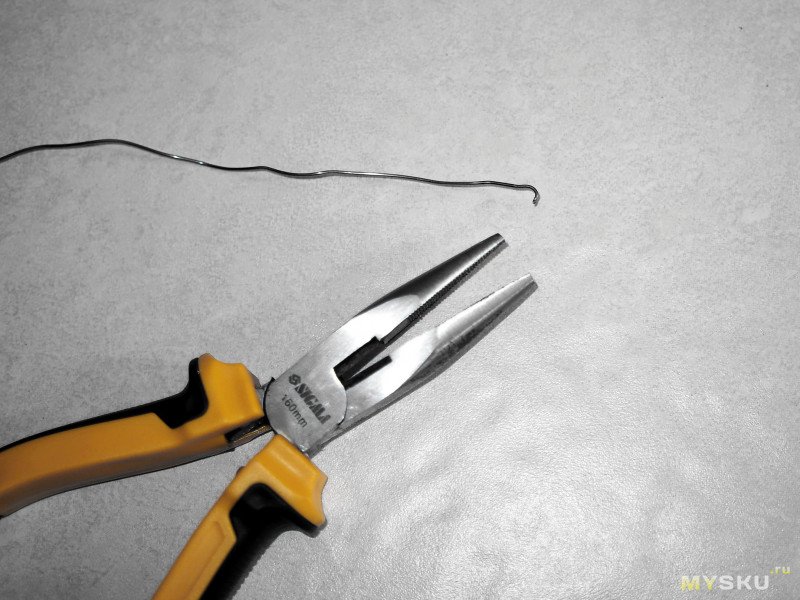 Но прием с водой не сработал. Два литра воды куда-то ушли безвозмездно. «Возможно через дренажное отверстие» — предположил Холмс. Зато ему удалось соорудить зацеп из тонкой стальной проволоки длиной около 40 см.