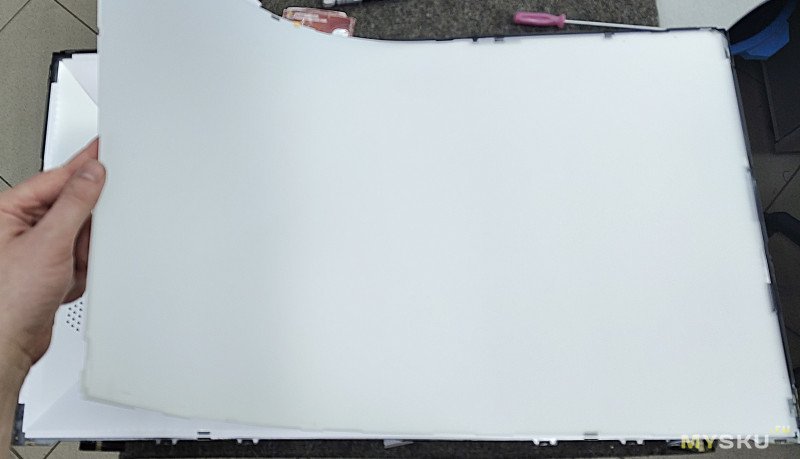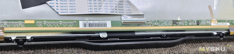 Снизу откручиваем один саморез, удерживающий нижнюю часть рамки, аккуратно отклеиваем платы матрицы (аккуратно со шлейфами)