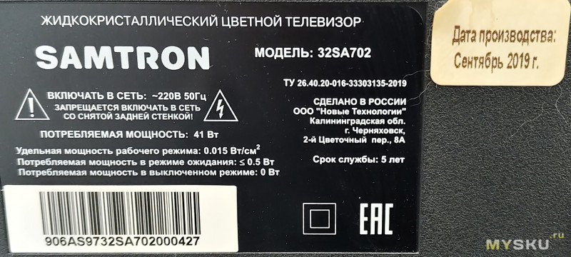 Производство сентября 2019 года, заявленный срок службы 5 лет. В ремонт поступил летом 2025 года — свое этот телевизор честно отработал, молодец:)