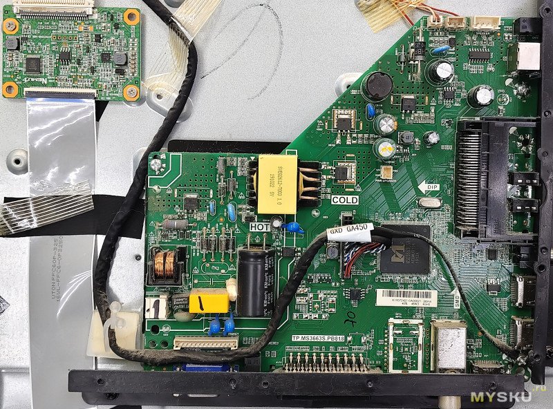 Внутри плата с блоком питания — tp.ms3663s.pb818 и t-con плата матрицы NTB320HD-N86_C0 (хотя я вижу nta320hd-n86-c0, но инфы нет)