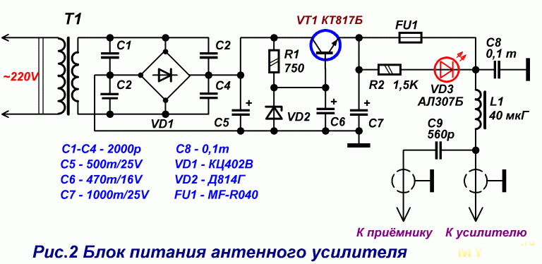 Ну и для сглаживания выходных пульсаций на выходе стоят два конденсатора