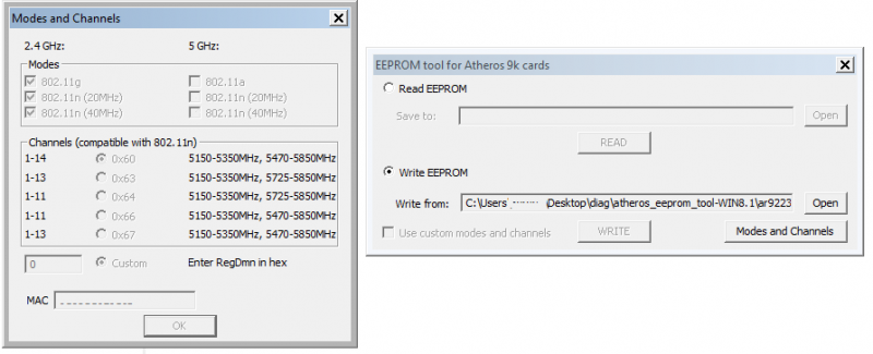 Выяснилось, что eeprom для ar9223 содержит некоторую конфигурацию, и в моём случае 13-ый канал недоступен. Будем шить.