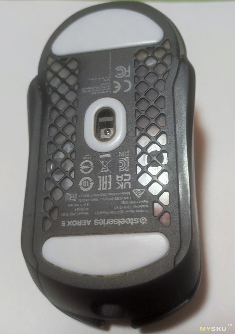 Мышь. Корпус — металл с дырочками. В комментариях на эту мышь мне писали, что по прошествии года эта мышь соберет в себе кучу грязи. Тем более я иногда люблю проводить время за компьютером с чаем и вкусняшками. И тут они немного ошиблись. Грязи мышь конечно собрала, но не в таких количествах, как мне предсказывали. По личному опыту был закуплен набор фторопластовых накладок. Но как не странно это не пригодилось. Износа практически нет!