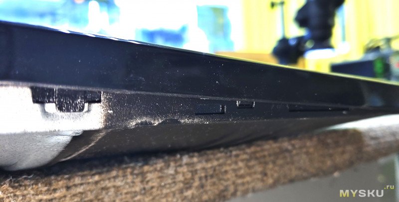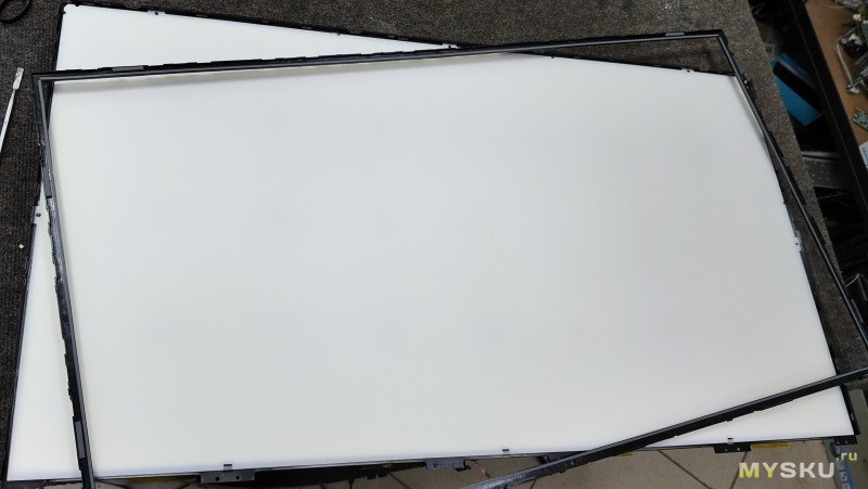 Переворачиваем телевизор экраном вверх и отщелкиваем внешнюю рамку. Она зацеплена за прорези в корпусе и при использовании инструмента (металлическая лопатка или пластиковая карта) отщелкивается без особого труда.