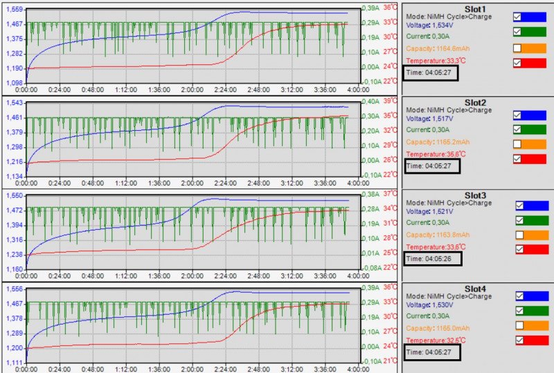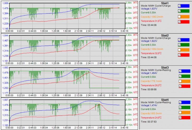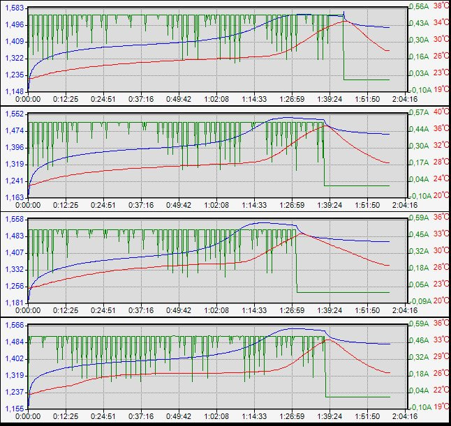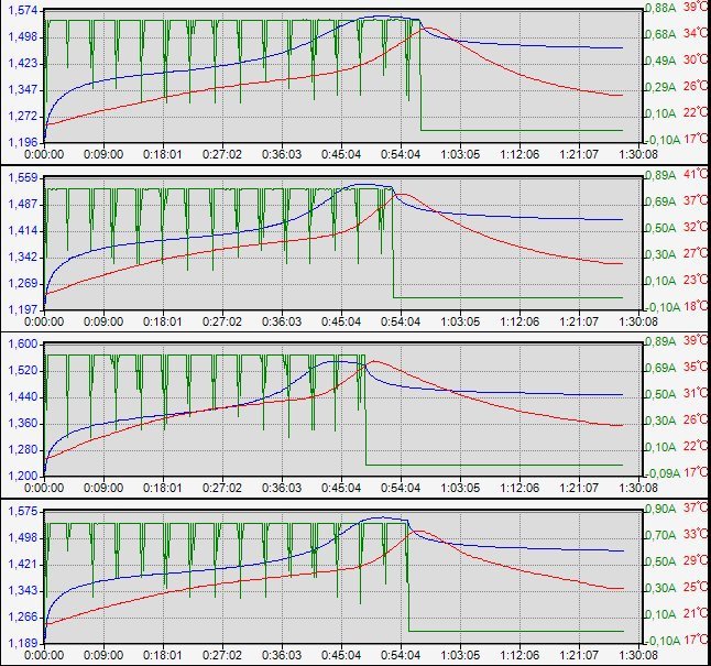 Такие графики выдает программа MC3000_Monitor.Красные кривые — температура. Хорошо заметный резкий подъем Т на заключительной стадии заряда — за счет активного протекания кислородного цикла. Следует понимать, что ячейки отличаются по емкости и находятся на немного разных стадиях завершения заряда. Для обр. №1 и №4 экстремум напряжения еще не достигнут. А для обр. №2 и №3 — уже пройден, через несколько минут произойдет остановка процесса после выполнения условия ∆V = — 3 mV. Соответственно, и температуры обр. №2 и №3 выше на несколько градусов.