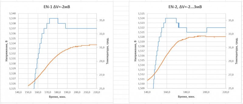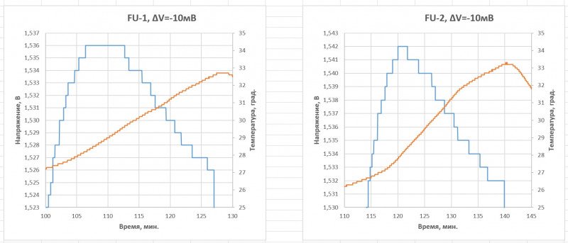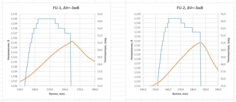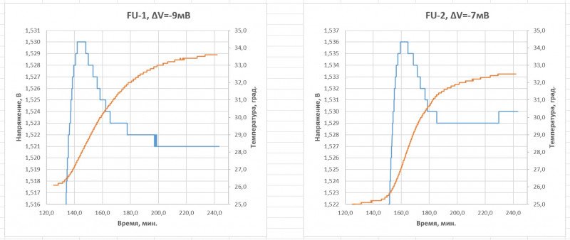 Все прошло нормально, ∆V=-10мВ зафиксирована для всех 4 образцов. Интересно, что максимум температуры всегда наблюдается чуть позже момента остановки заряда.