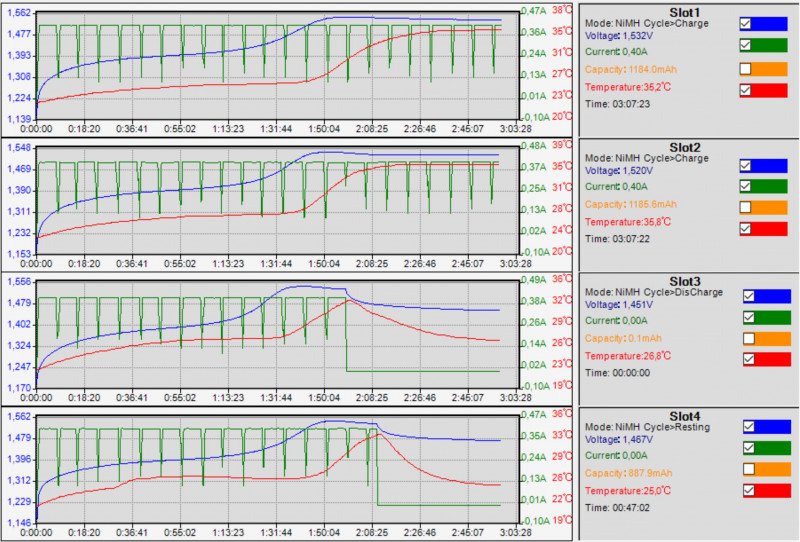 На картинках заряда и разряда показано, что заряд ячеек производится током 800мА, а критерием завершения заряда является ∆V=-10мВ. Вот от этого и будем далее танцевать.В опытах использовалась известное ЗРУ SkyRC MC3000. Для Ni-MH оно позволяет выставить значение ∆V от -3 до -20мВ. Замеры на предмет поимки ∆V производятся при кратковременном отключении нагрузки 3 раза в минуту.